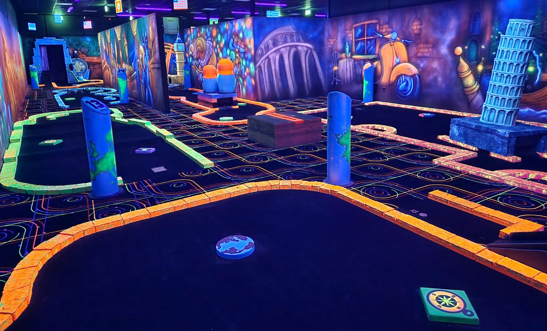 Glowgolf is een leuke activiteit voor jong en oud: een kleurrijke, verlichte minigolfervaring waarbij plezier en beleving centraal staan. Of je nu fanatiek speelt of gewoon komt voor een gezellig uitje, de baan zit vol verrassende effecten en leuke uitdagingen. Tijdens het spelen maak je als het ware een glow-in-the-dark wereldreis: je begint tussen iconische decors die doen denken aan wereldsteden en bijzondere plekken, komt langs ijzige poolgebieden met speelse bewoners, slingert door bruisende straten en reist verder naar exotische jungles vol indrukwekkende dieren.